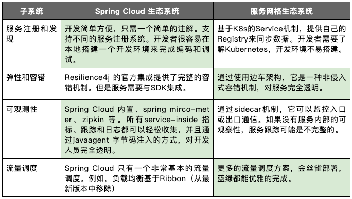 Java 技术栈的迁移问题。特别是 Spring Cloud 与基于 Kubernetes 的服务网格有着完全不同的架构。要迁移Spring的应用,必须放弃 Spring Cloud 的解决方案,例如服务注册和发现、配置管理、弹性和容错等。但是,Spring Cloud 比当前的基于Kubernetes 的服务网格在服务治理上更加成熟和企业级。
