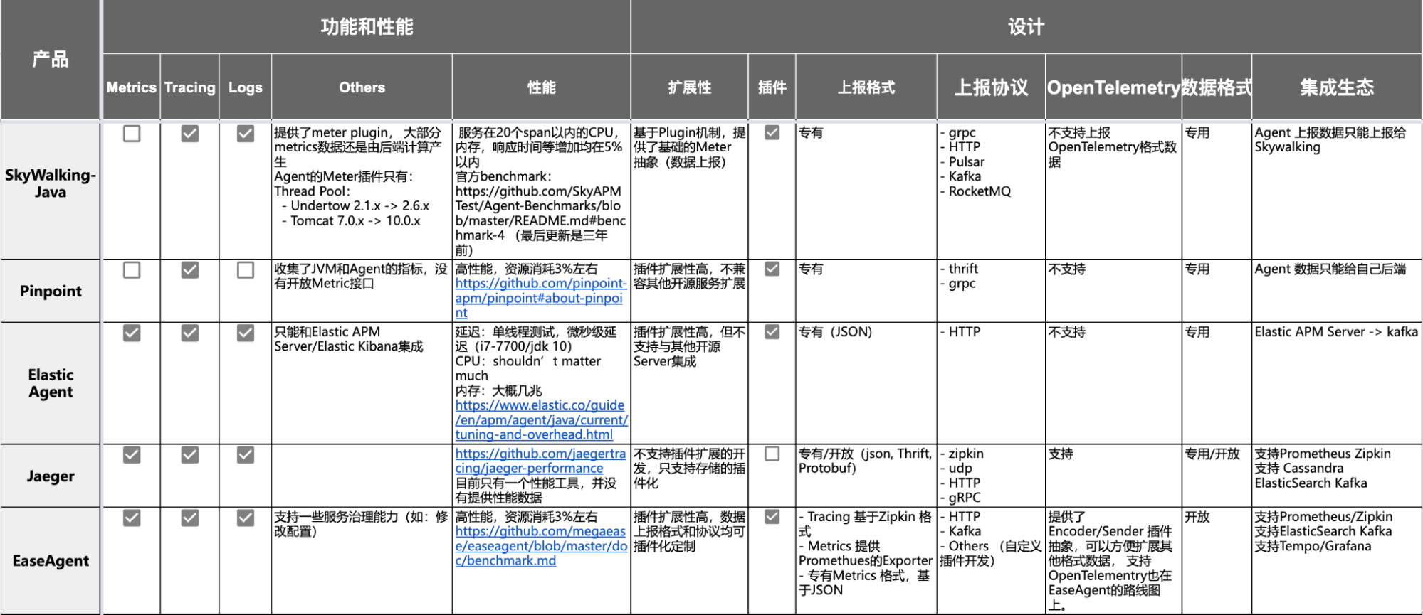 基于以上几个维度的考量,我们对部分开源 Java Agent 进行了对比,列表如下。从列表可见,符合轻量、标准、开放和易扩展的 Java Agent 组件是稀少缺失的,这也正是我们最初开发EaseAgent的缘起。