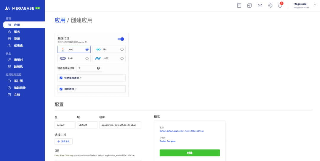 - Java 应用探针 EaseAgent。在您部署 Java 的 Docker 应用并打开 APM 开关时自动化集成。