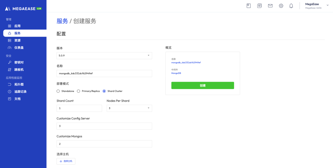 上述的这些软件都支持以集群或是单机版的方式部署,您只需要选择相关的主机就可以了,MegaEase Cloud 解耦了主机和节点,所以,您完全可以把一个集群的所有节点都部署到一台主机上。注意**,这里不是容器化部署,是主机部署**。