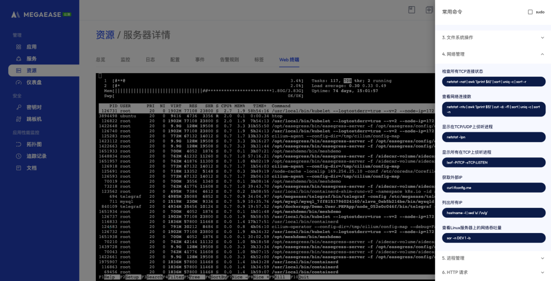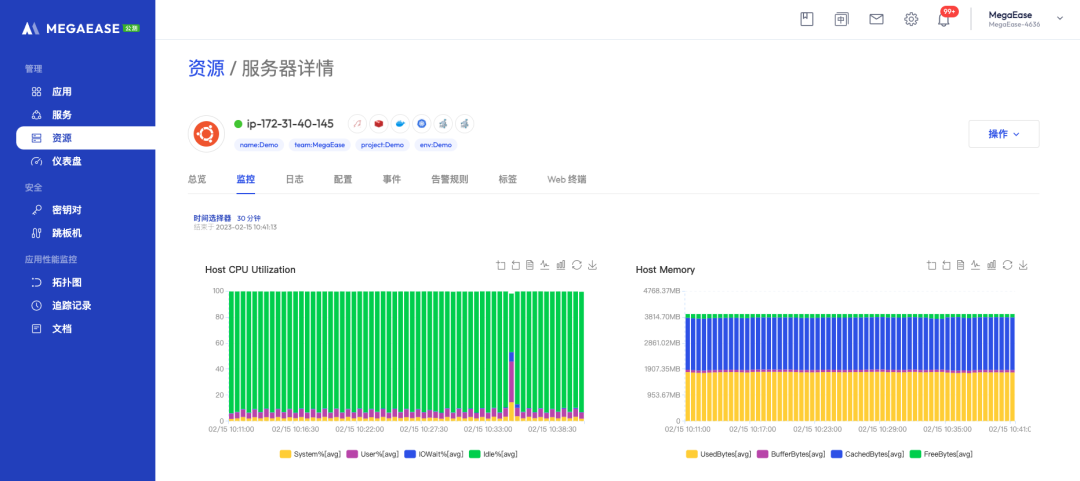 首先,您需要到“资源”管理页中把您的服务器添加到 MegaEase Cloud, 这需要您授权 MegaEase Cloud 的 SSH 访问权限,一旦主机添加完成,MegaEase Cloud 会自动地在主机上安装开源的监控软件 Telegraf ,通过 mTLS 的双向认证向我们的服务器发送相关的监控数据,并自动安装CPU/内存/硬盘等使用率的常规报警,您还可以在我们的 Web 终端上设置服务器的内核参数,查看系统日志,自定义告警规则,以及使用一个集成了很多常用命令的 Web Terminal。