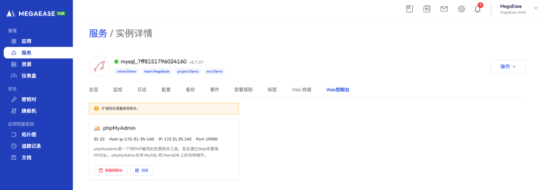 - Web 控制台:MegaEase Cloud 集成了一个或多个主流的开源的 Web 控制台,您可以使用这些控制台来管理相关的基础软件。
