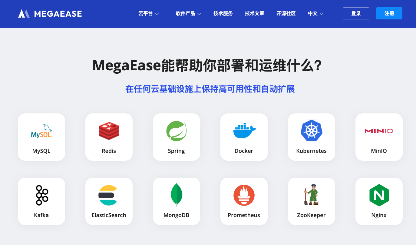 2023 年 2 月,我们发布了 MegaEase Cloud 平台。在该平台上,用户只需将自己的主机添加进来,就可以轻松部署各种开源基础软件服务,如 MySQL、Redis、MongoDB、Kafka、ElasticSearch、Docker、Kubernetes 等。同时,您还可以方便地对这些服务进行运维,例如:监控、告警、日志、配置、扩容、缩容、克隆……等。此外,我们还支持 Docker Compose 和 Kubernetes 的应用部署。通过使用我们支持的 Zipkin 协议 SDK 或 Service Mesh,您也可以立即获得 APM 功能。