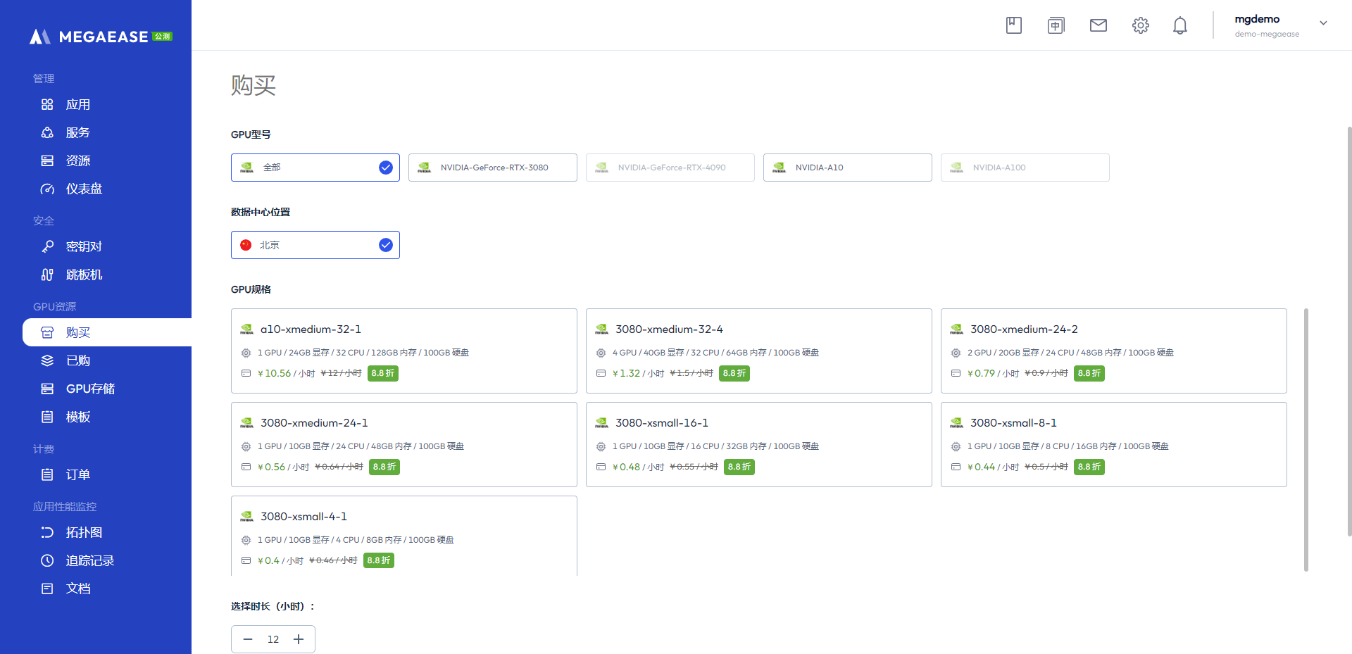 在 cloud.megaease.cn 上, 通过GPU 服务, 提供了您一个可以低成本使用GPU 的平台。登录我们的平台后,通过GPU 资源下的购买菜单你可以看到在数据中心罗列的GPU资源: