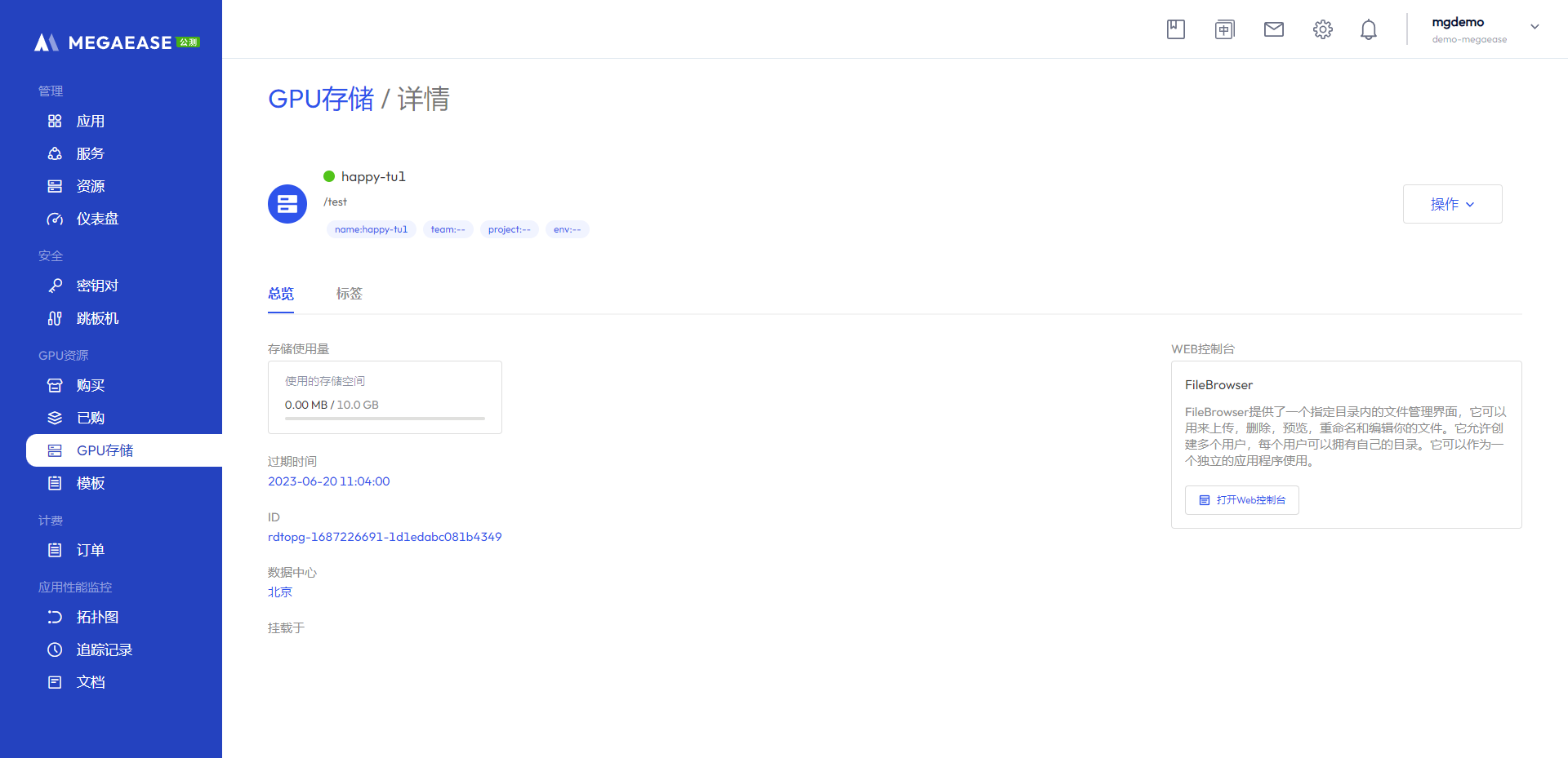 你只要购买一定容量的存储后, 在你启动GPU服务时, 你可以将你的存储挂载到指定目录。同时我们也提供了存储访问的界面。通过点击打开Web 控制台,你可以上传或下载你的数据。